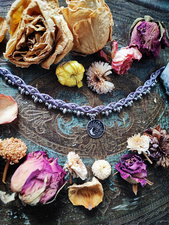 Collier ras-de-cou en micromacramé, finement tissé à la main, disponible en deux coloris : mauve ou bleu d’orage 🌩️. Il est orné de perles en acier inoxydable argenté ✨, apportant éclat et durabilité, ainsi que de médaillons lune 🌙 et nuages ☁️, symboles de rêve, d’intuition et de liberté. Son design délicat et léger en fait un bijou bohème, céleste et minimaliste, parfait pour sublimer le cou avec élégance.