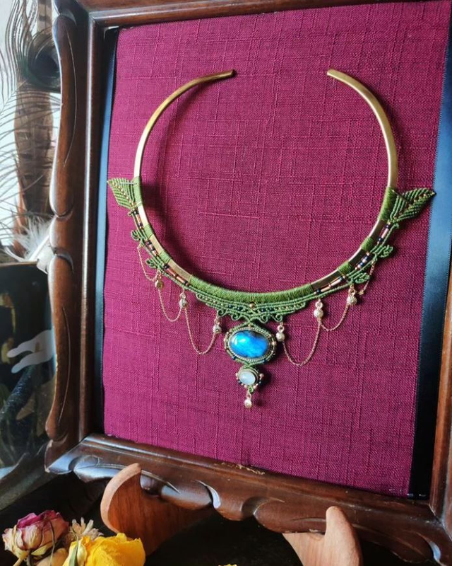 Découvrez notre torque inspiré du royaume sylvestre du Seigneur des Anneaux. Confectionné en fil Linhasita vert feuille de 0,75 mm, il arbore une perle de verre, une chaîne en acier inoxydable et une breloque en plaqué or. Orné d'un cabochon de labradorite, connu pour sa capacité à renforcer l'intuition et la créativité, et d'une pierre de lune, réputée pour son soutien à l'équilibre émotionnel et à la sérénité. Ce bijou fusionne beauté, mystère et propriétés bienfaisantes des pierres.